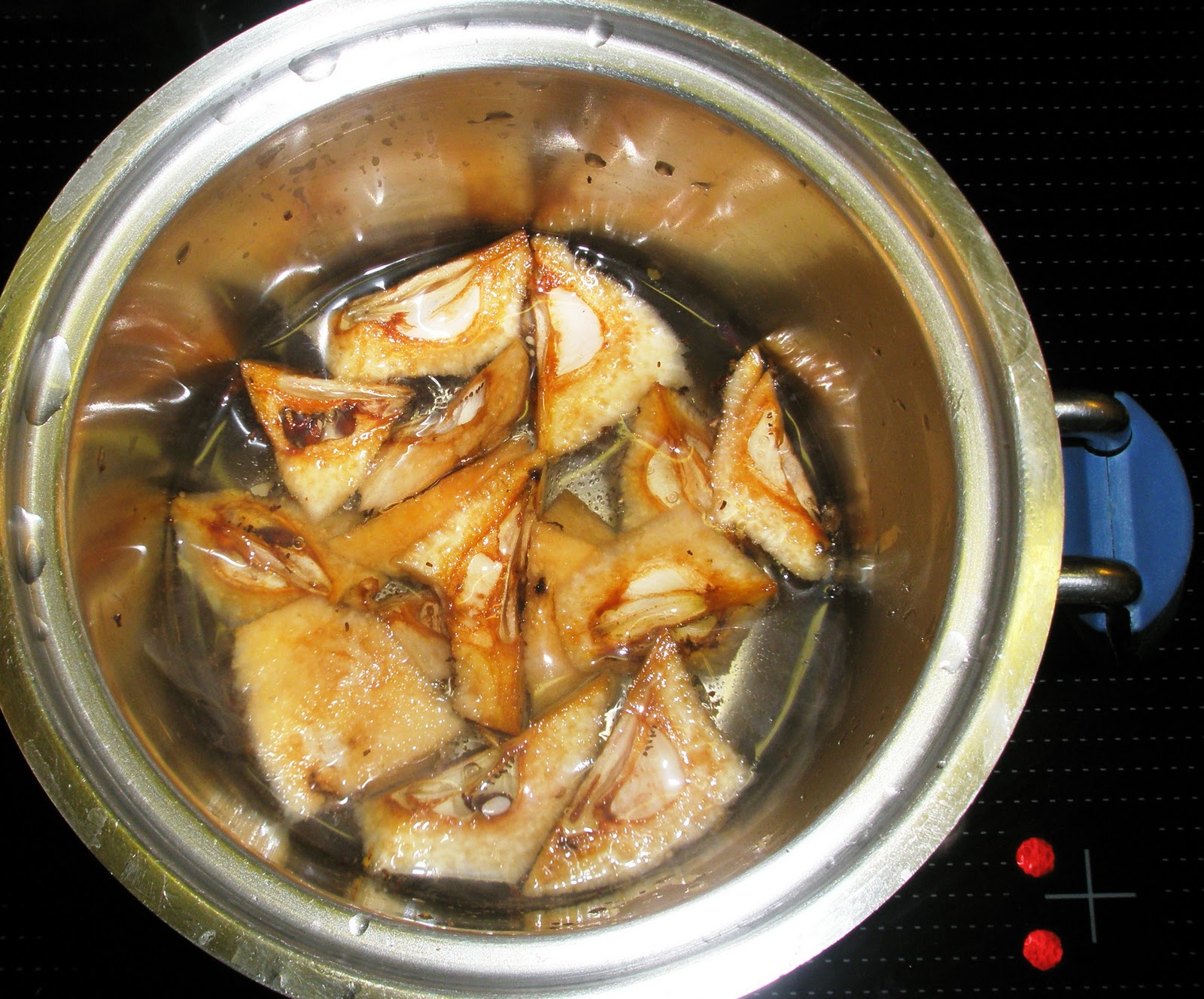 • Bullir els 15’ els cors a foc viu en un recipient a part amb tres o quatre dits d’aigua. Les llavors del codony contenen pectina, una substància que posteriorment afegirem i que ajudarà a espessir.