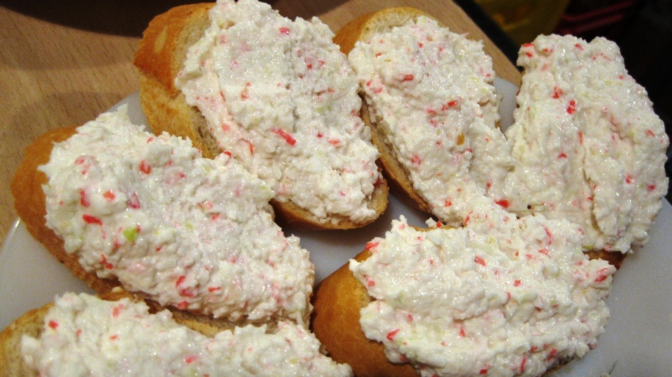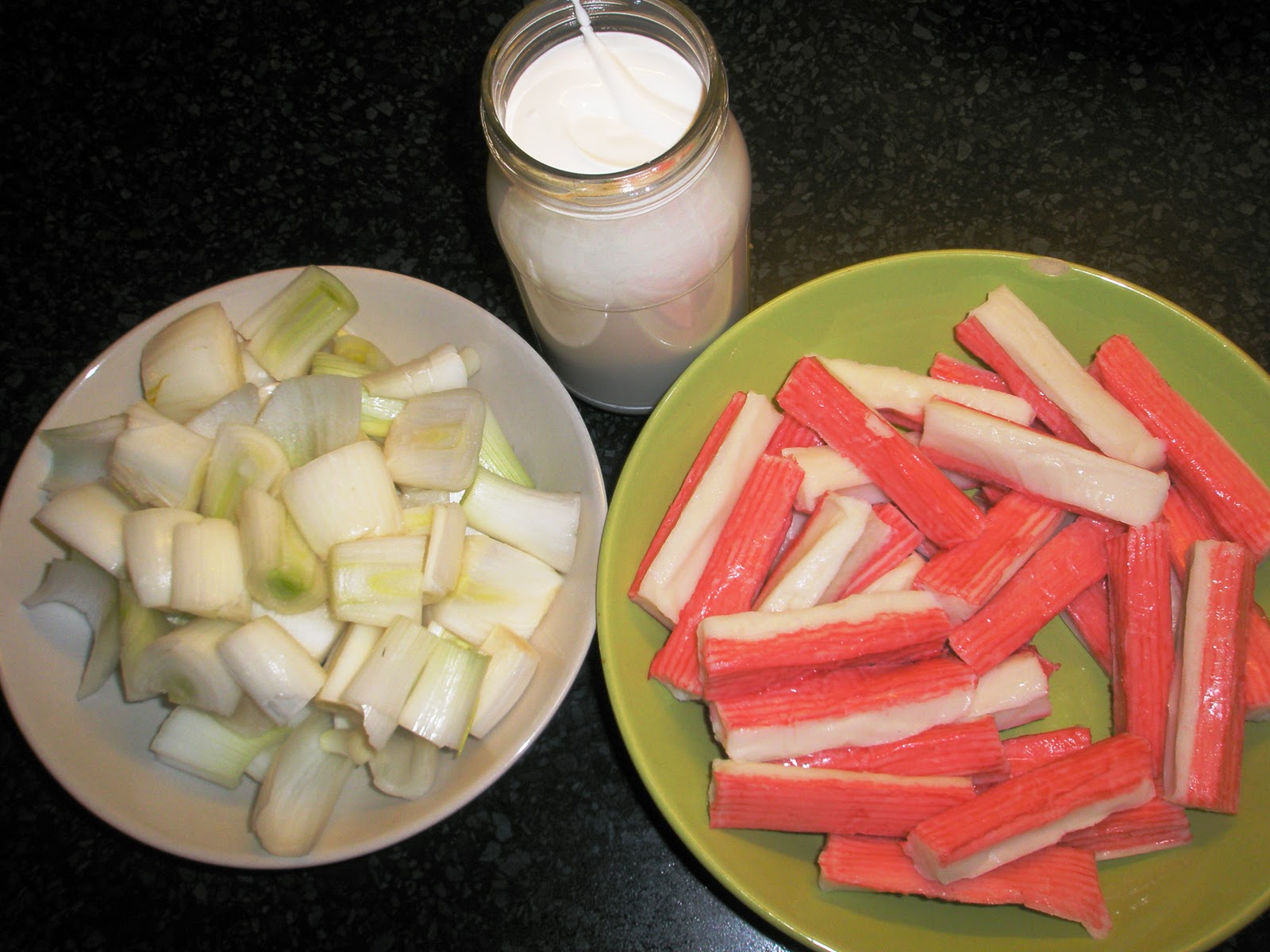 Ens caldrà: ceba tendra, barretes de cranc i maionesa