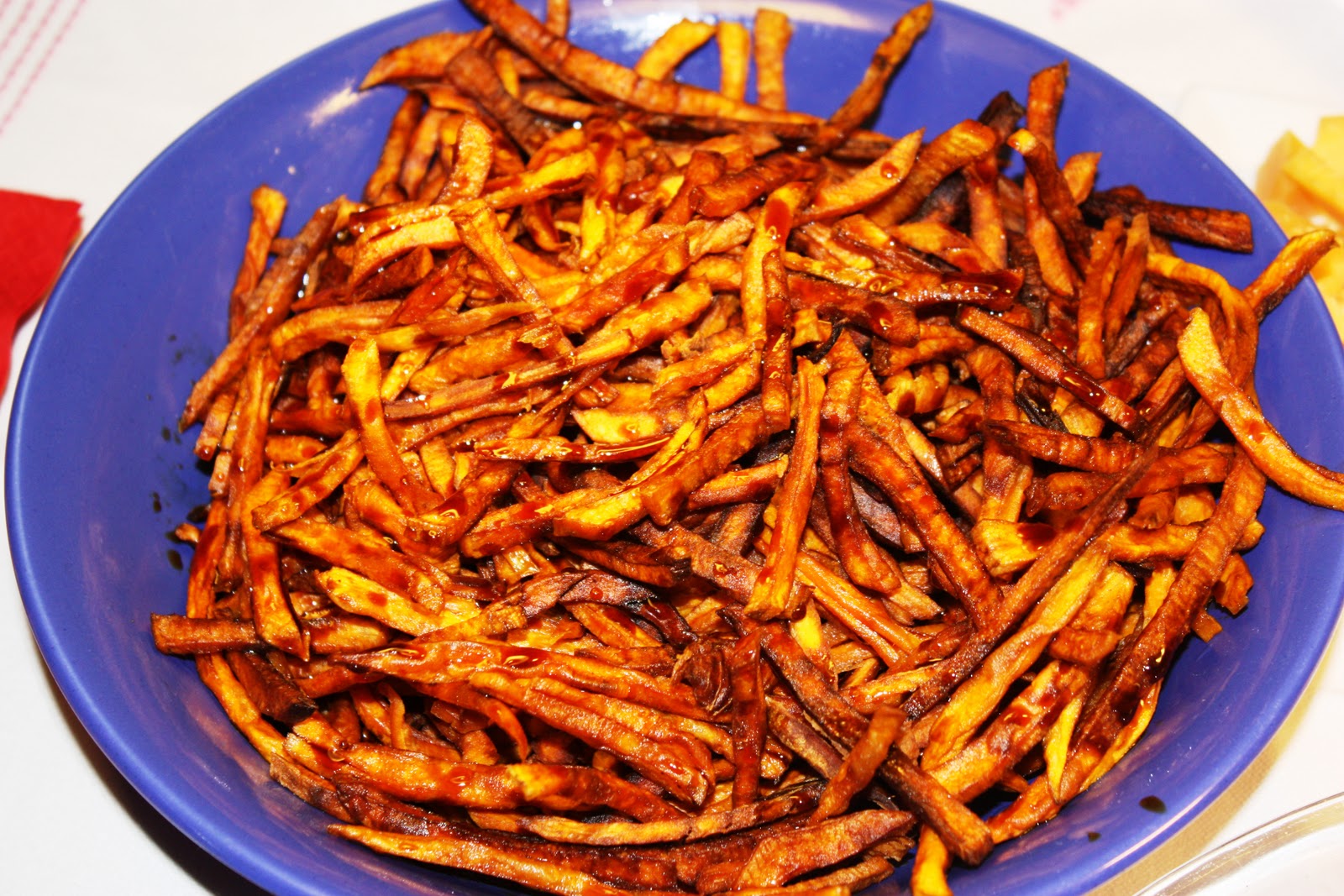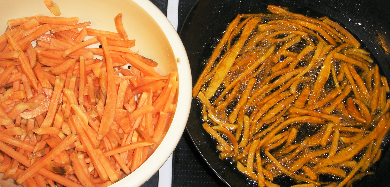 Es tracta d’un “snak” a base de filatejar moniatos i fregir-los amb oli d’oliva ben calent.