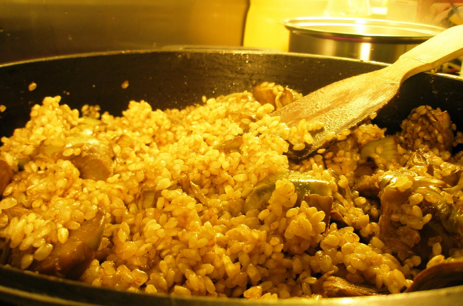 Ho deixem daurar una estona fins que quedi ben cuit. Ho salpebrem i afegim una tasseta de vi blanc, xeres blanc i negre, etc… Afegim l’arròs i ho remenem a foc lent una bona estona. Quan l’arròs està ben torrat, afegim el brou a mica en mica i sacsegem sovint la cassola. A mida que es va bevent el caldo, n’afegim controlant la textura i la cocció de l’arròs