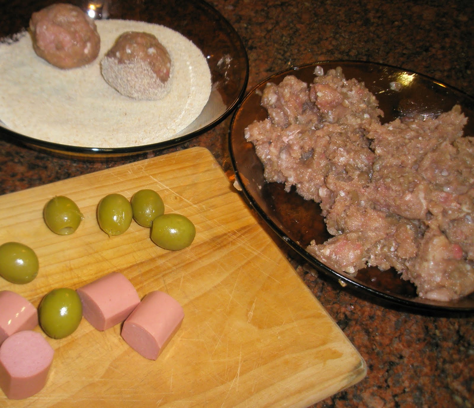 Certament teníem tots els ingredients bàsics per a les mandonguilles (carn picada de porc, vedella o barrejada, un ou, sal, pebre, all, julivert, pa ratllat i oli) i una cosa bàsica: temps. Per la resta es va imposar el “farciment de la sort” o sigui que vam inspeccionar nevera i rebost el noi va optar per tres ingredients: oliva, frankfurt i pastanaga.