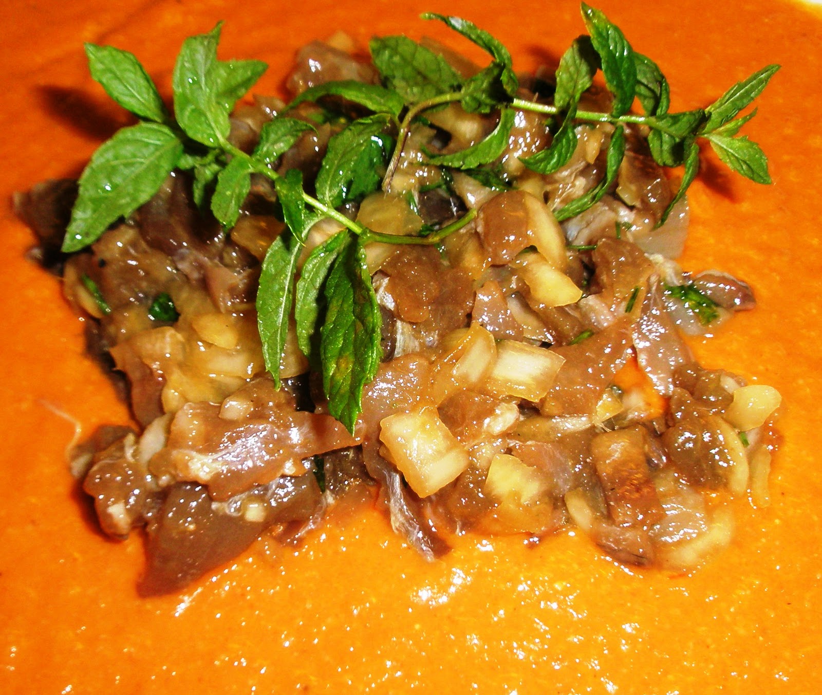 Un dels plats que ens va explicar va ser un “tàrtar de sardines i anxoves amb sopa de romesco”. Va ser el plat que més em va cridar l’atenció i al cap d’uns dies, vaig aprofitar un sopar a casa amb la família per a fer-lo. Tal i com vaig interioritzar, vaig fer unes lleugeres adaptacions tant en la sopa de romesco com en el peix ja que finalment el peix escollit va ser la tonyina i concretament la part de la ventresca. Em feia moltíssima mandra treure les espines a les sardines, què voleu!