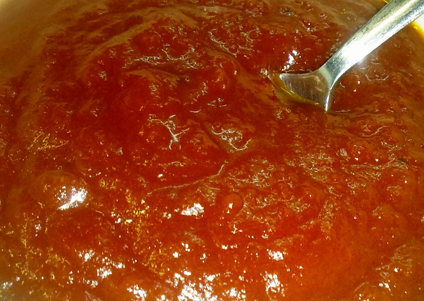Per a fer aquesta salsa ens caldrà: mig quilo de tomàquet natural triturat, 1 ceba mitjana picada, 4 alls, un bon raig d’oli d’oliva, 3 cullerades soperes de sucre, 3 cullerades soperes de mel, 8 cullerades de vinagre de poma. Espècies: comí, pebre en gra, clau, una cullerada de mostassa, nou moscada, sal i un manat de julivert, farigola i romaní.
