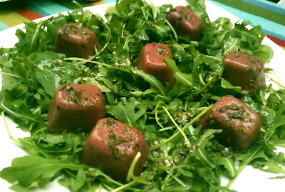 Un cop abocat al motlle, cal posar-ho a la nevera per a que qualli. Deu minuts abans d’emplatar, poseu-ho al congelador per a facilitar que surti del motlle sense que es trenqui. En aquest cas, vaig fer servir una mica de rúcula que tenia l’Oriol a la nevera tot que deixo la fullaraca a la vostra imaginació. Cal amanir-ho amb una mica de gràcia i si és amb una vinagreta, molt millor.