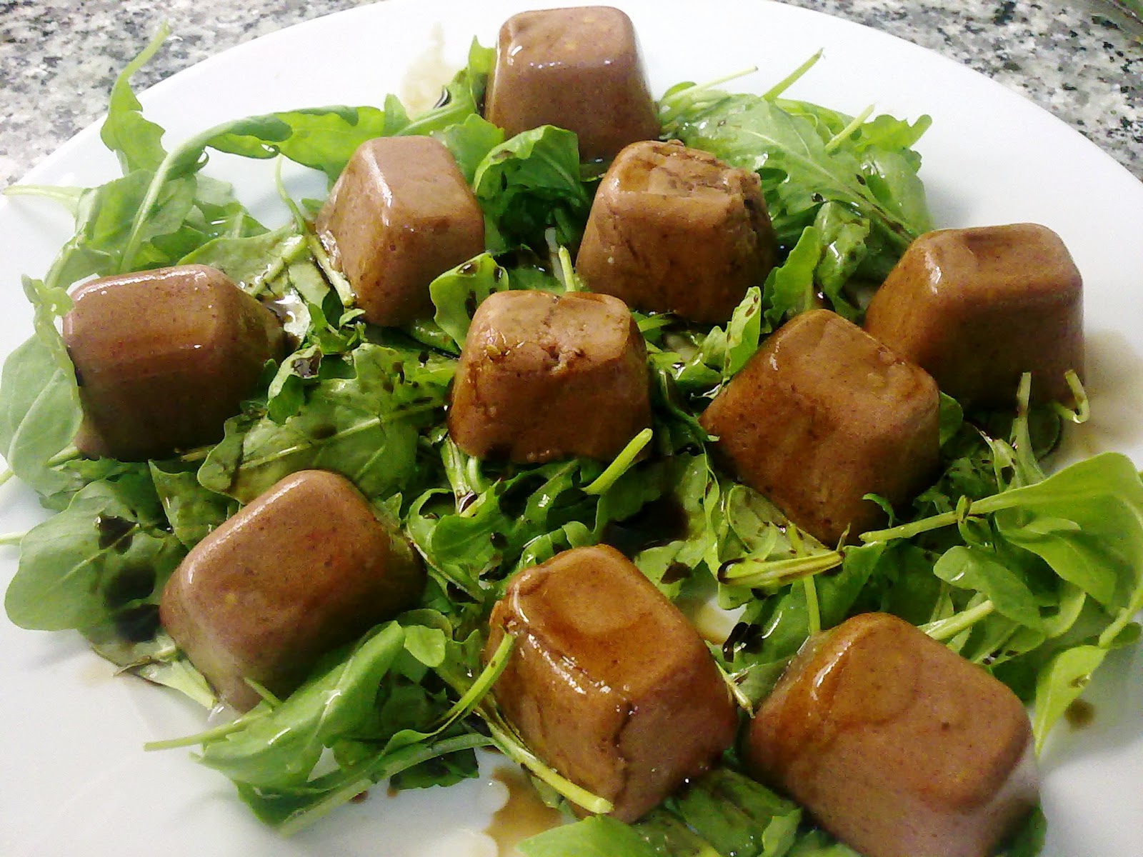 Un cop abocat al motlle, cal posar-ho a la nevera per a que qualli. Deu minuts abans d’emplatar, poseu-ho al congelador per a facilitar que surti del motlle sense que es trenqui. En aquest cas, vaig fer servir una mica de rúcula que tenia l’Oriol a la nevera tot que deixo la fullaraca a la vostra imaginació. Cal amanir-ho amb una mica de gràcia i si és amb una vinagreta, molt millor.