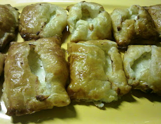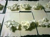 Després, estirem la pasta de full i la tallem a rectangles (o quadrats…) i distribuïm el farcit entre totes les planxes. Ho tapem i amb compte segellem el farcell (és important fer-ho bé per a que no es coli el formatge i vessi quan estigui al forn).