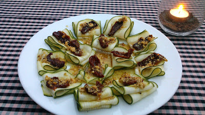 Menjar el carabassó en carpaccio és tot un descobriment!! fa poc vaig fer una amanida amb formatge i el resultat em va agradar molt, la provaré també amb tomàquets secs (que m'encanten i els poso a tot arreu!!)