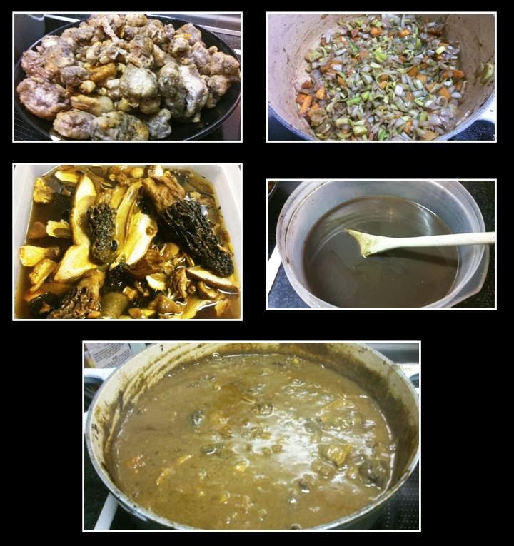 Passades les dues hores, vaig afegir un grapat de ceps i múrgoles que tenia amb aigua i al cap de 15 minuts una picada feta amb un tall de tòfona, una mica d’aigua dels bolets, all, julivert, ametlles, avellanes i pa torrat. Tot ben triturat i cap a dins de nou deixant coure 10 minuts més i tancar, deixar temperar i reposar fins a l’àpat de l’endemà.
