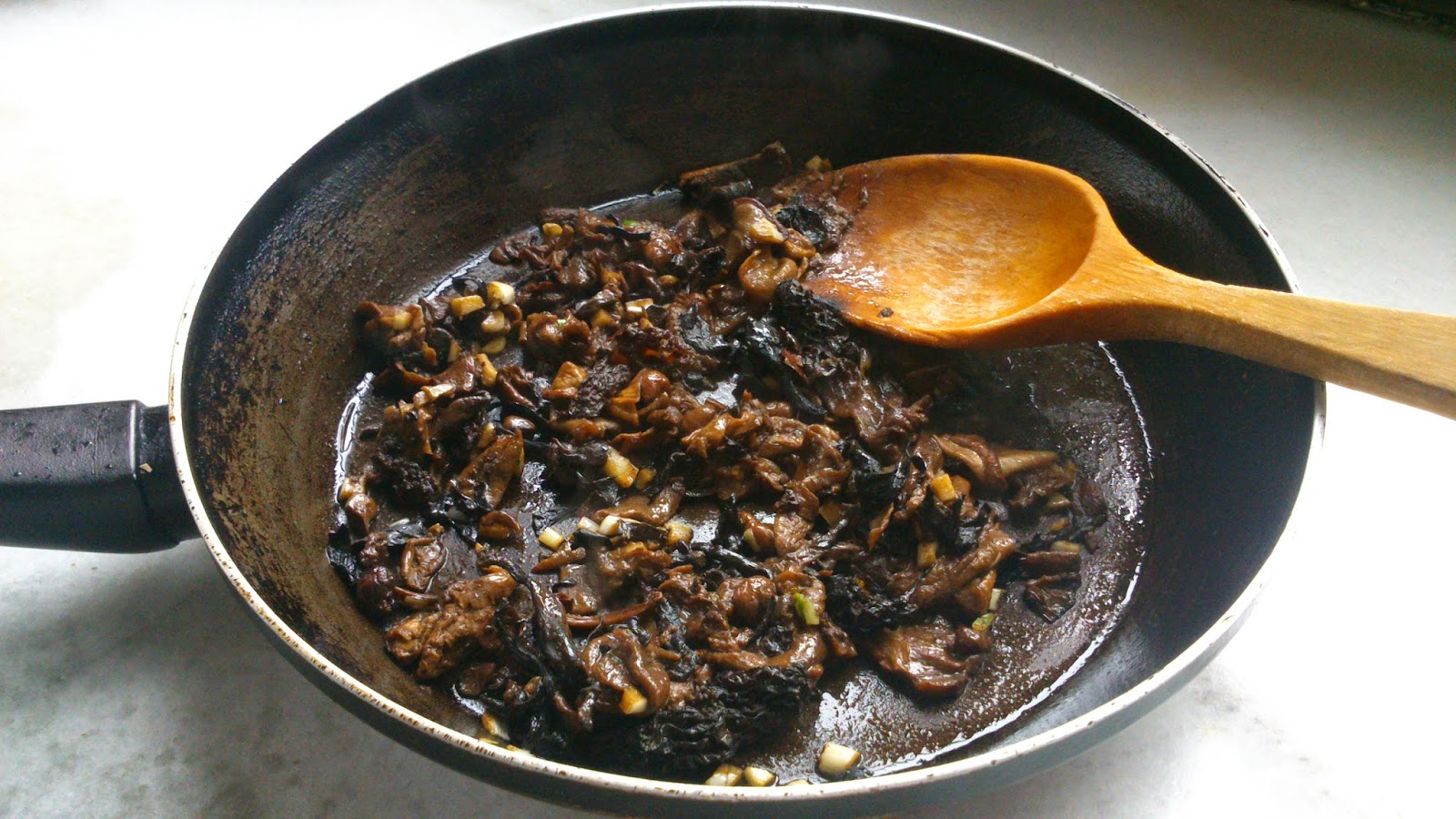 Després d’haver-nos guanyat el dinar amb una bona caminada per les muntanyes de la zona va ser el moment de continuar amb l’arrosset!. Mentre posava a escalfar el brou de carn vaig colar els bolets i un cop escorreguts i tallats, els vaig saltejar amb els alls picadets i una mica d’oli. l’aigua d’haver-los hidratat la vaig colar i va anar directe al brou de carn.