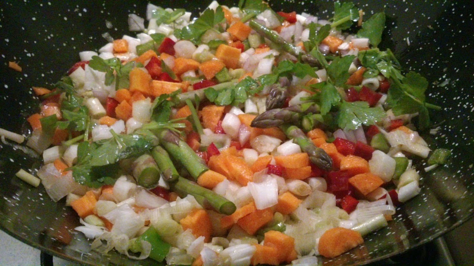 Per el sofregit vaig fer servir: deu calçots petits (dels que no es poden coure a foc viu perquè es volatilitzen), un parell de rodanxes de pebrot verd i vermell, quatre espàrrecs verds, dues pastanagues, unes fulles d’api, 500 gr de tomàquet triturat, un parell de gots de cava, sal, sucre i pebre i oli.