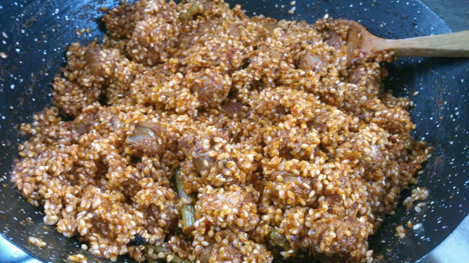 Tot el que estava triturat va sofregir de nou durant uns quinze minuts a foc lent rectificat de sal, pebre i sucre. Passats aquests quinze minuts, era el moment d’afegir el cava i deixar reduir de nou. Aleshores vaig aprofitar per a tallar la botifarra cuita a rodanxes i la vaig afegir al sofregit. Era el moment de deixar-ho coure uns minuts més i deixar reposar fins l’endemà…