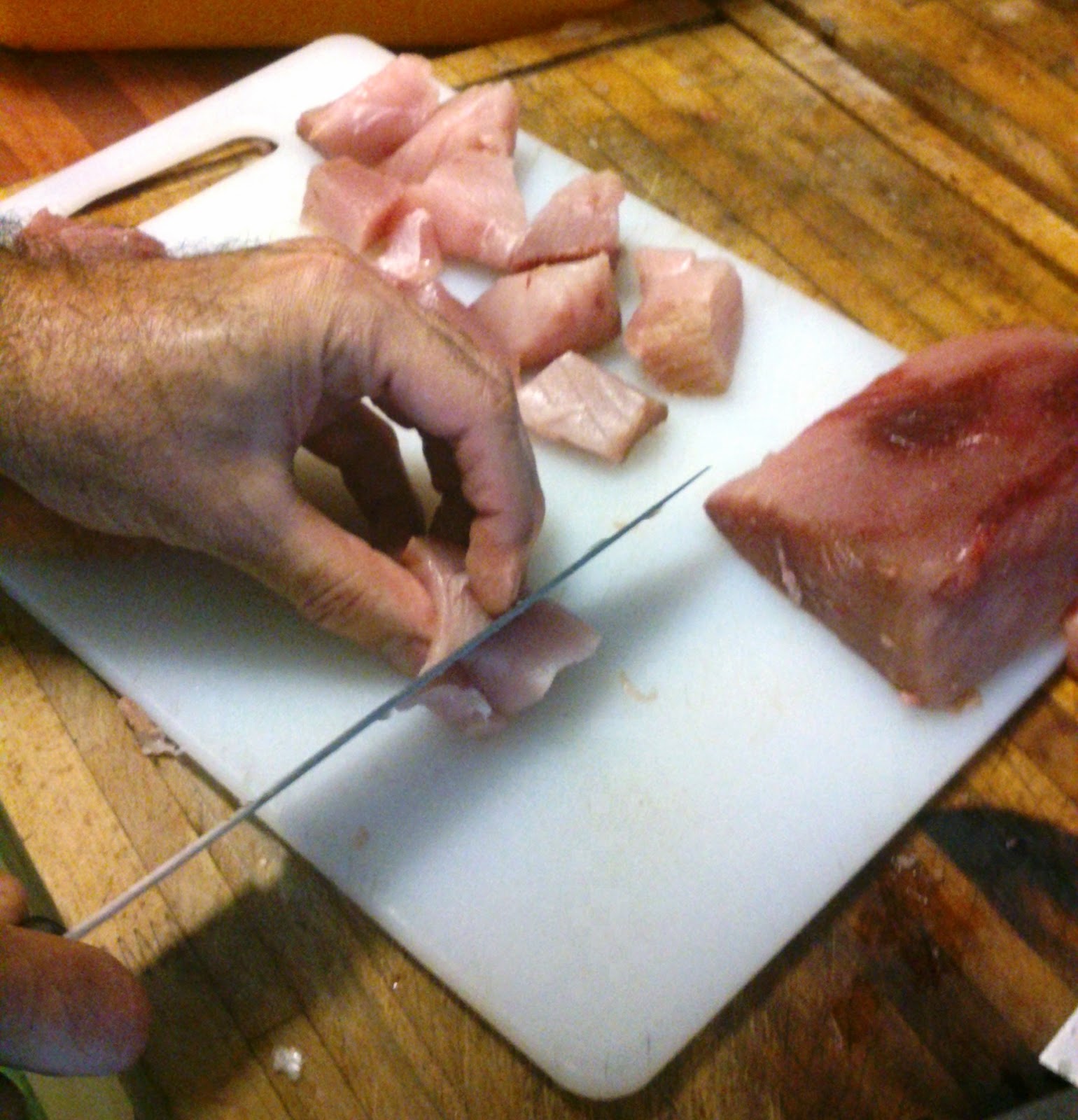 En primer lloc ens caldrà: 500 gr de tonyina a daus, dos alls, 20gr de gingebre fresc picat, una cullerada de pebre negre, dues fulles de llorer, dues cullerades de salsa de soja, dues cullerades de vinagre de, chardonnay, una cullerada de sucre, 50 gr d’oli d’oliva, 10 gr d’oli de sèsam.