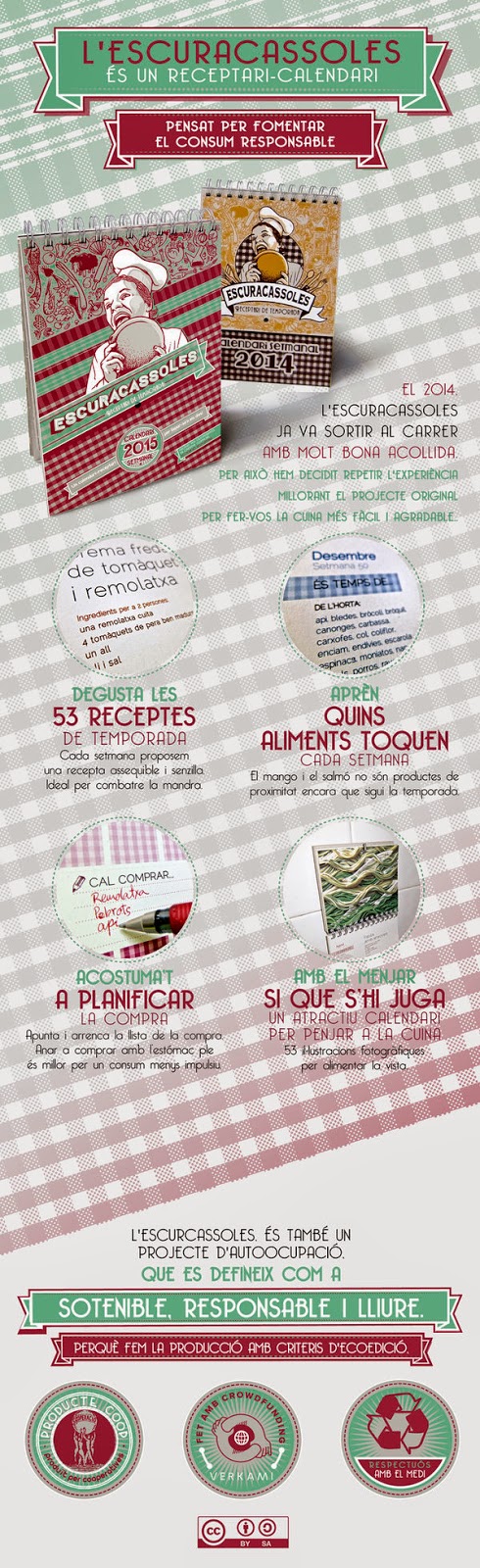“…és un calendari-receptari pels que volem menjar bé encara que no puguem dedicar molt temps a estar-nos entre els fogons. Sentim a parlar d’aliments de proximitat, de productes de temporada… Però, aquest peix es pesca al Mediterrani? A la fruiteria hi ha tomàquets però… ara n’és temps? A l’Escuracassoles podreu trobar-hi respostes…”
