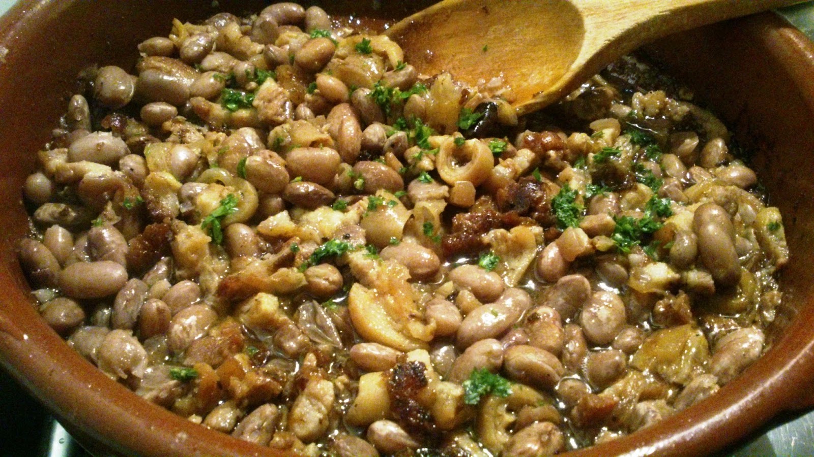 Les mongetes ja les tenia cuites del dia abans (veieu com coure llegum) per tant, vaig començar per a preparar els peus traient tota la ossamenta i tallant-los a tires-daus prims. Vaig fer el mateix amb la cansalada i ho vaig coure a foc fort amb oli i quan va estar ben torrat ho vaig separar (important no treure la gelatina que s’haurà incrustat al cul de la cassola). Amb el mateix oli vaig sofregir una mica de ceba a foc lent i quan va estar daurada vaig afegir un all tallat a trossos i cinc minuts després una cullerada de tomàquet triturat, sal, pebre i una tassa de cafè de vi ranci.