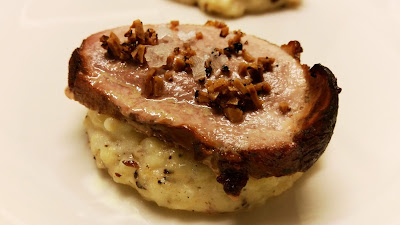 Amb la carn primer vam pintar-la amb mel i la vam marcar amb mantega a foc fort per a que ens quedes al punt per dins. Un cop cuita, vam tallar-la a rodanxes i la vam posar sobre una base de parmentier i amb una mica de tòfona picada i escames de sal per sobre. Voilà!