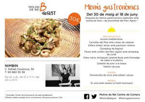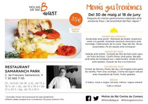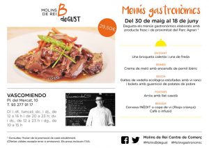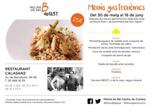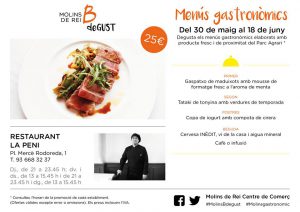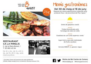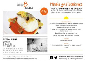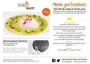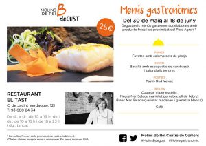 Entre el 16 de maig i el 18 de juny es podrà gaudir d’una oferta gastronòmica sense precedents a 41 establiments de la vila. “Molins de Rei BdeGUST” oferirà durant les primeres dues setmanes tapes i platets a 3 euros, i durant les tres següents menús d’entre 25 i 35 euros fets a partir de producte fresc i de proximitat. També hi haurà quatre demostracions de cuina en viu al Mercat Municipal.
